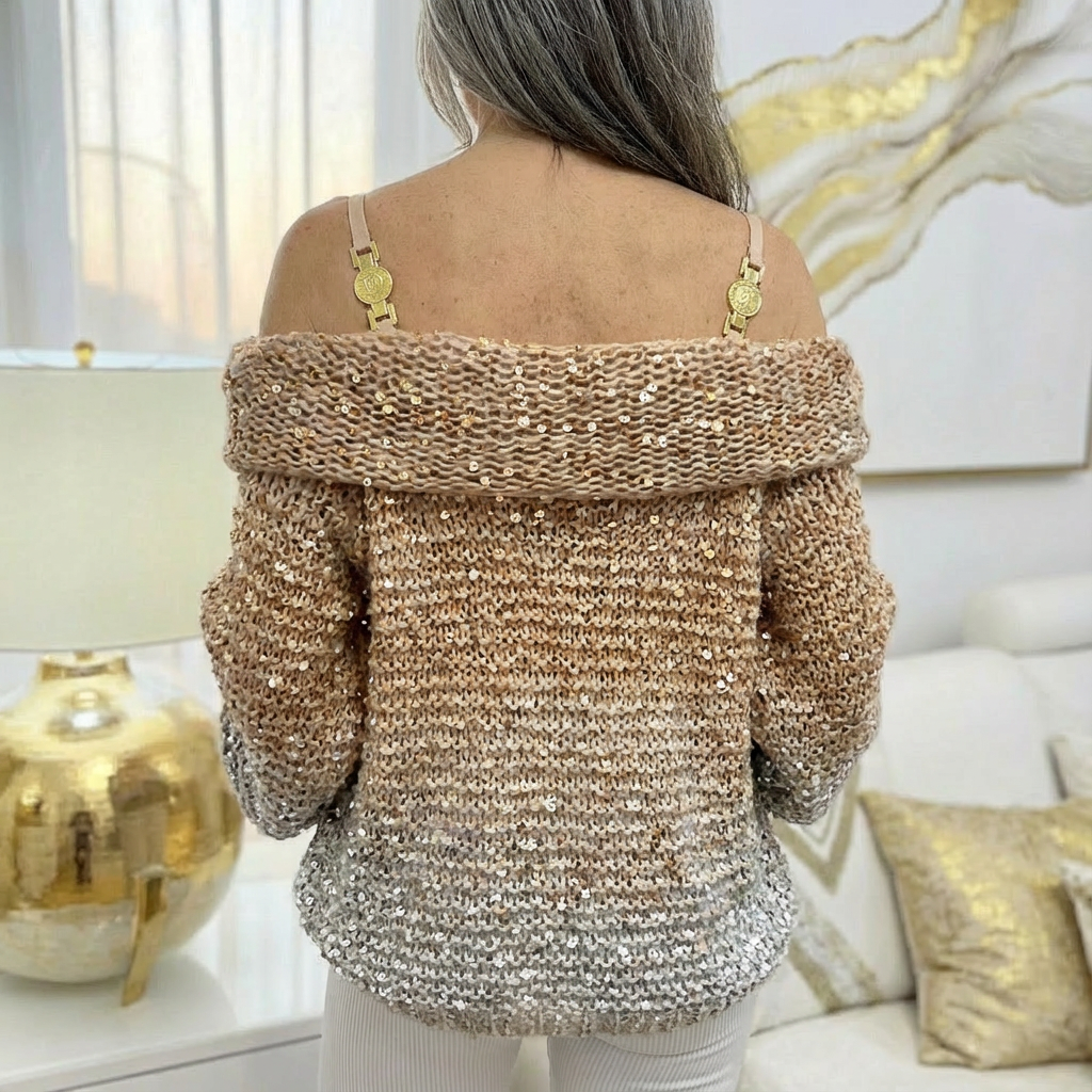 The Luna Off-Shoulder Sequin Knit Top is designed for women who want to feel feminine, refined, and comfortable at the same time.