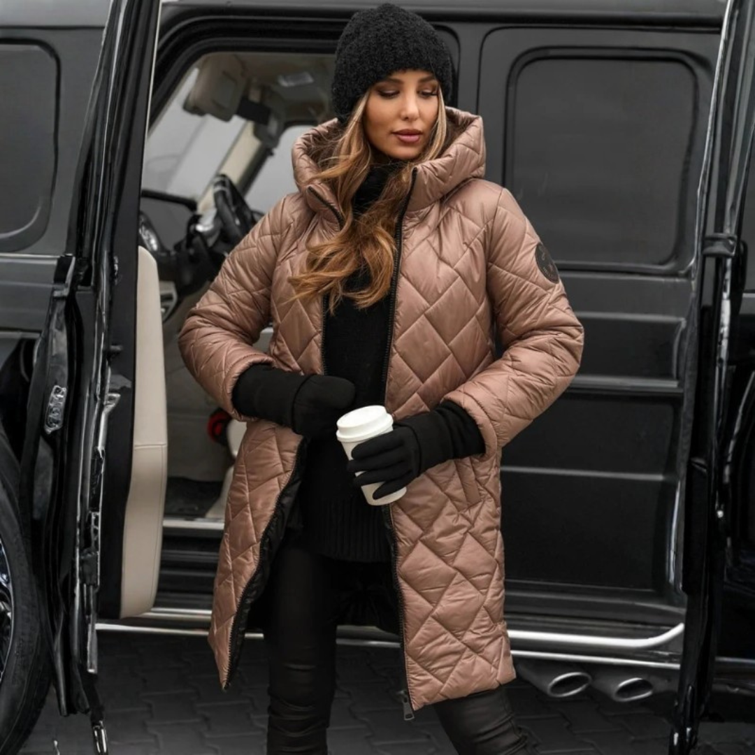 Introducing the Elegant Vera Coat – a perfect blend of style, comfort, and functionality for the modern woman. Featuring a modern quilted pattern that beautifully accentuates your silhouette, this coat is designed for those chilly days.