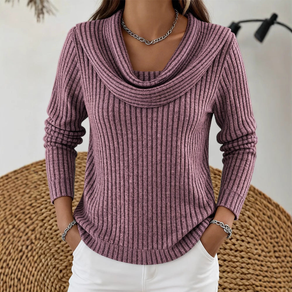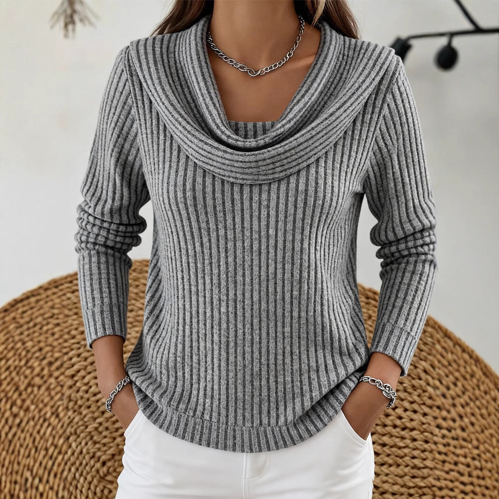 Crafted from a soft, stretch-knit fabric, this top features a flattering ribbed texture and a beautifully draped neckline that adds subtle sophistication without feeling overdone. The relaxed yet feminine fit skims the body comfortably, making it perfect for both casual days and more polished looks.