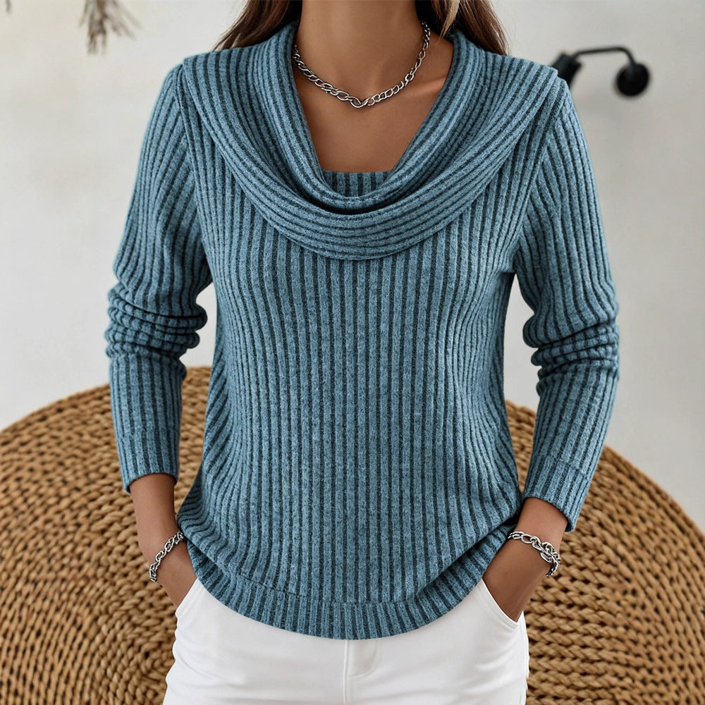 Effortlessly refined and endlessly wearable, the Ribbed Draped-Neck Knit Top – Soft Olive Green is designed to bring comfort and elegance into your everyday wardrobe.